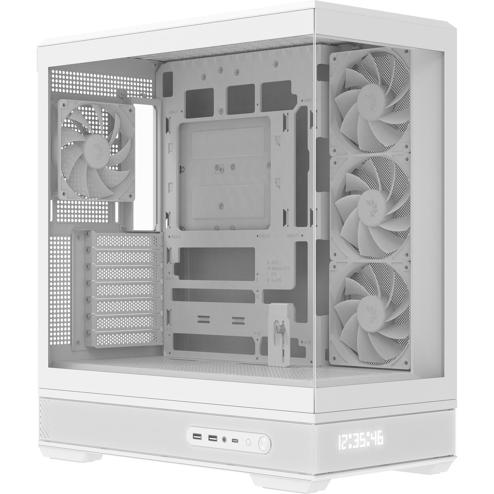 El AeroCool P500B Digi es una caja de torre media de alta calidad que combina estilo y rendimiento con paneles de vidrio totalmente templado y una elegante pantalla LED de píxeles de puntos para estadísticas del sistema en tiempo real. Está equipado con cuatro ventiladores ARGB PWM de gama alta, admite montaje de GPU horizontal y vertical y está optimizado con conectores en cadena y compatibilidad con placas base BTF para construcciones limpias. Las características bien pensadas, como un panel lateral a presión y un soporte de GPU ajustable, hacen que las actualizaciones y el mantenimiento sean fáciles y eficientes.
