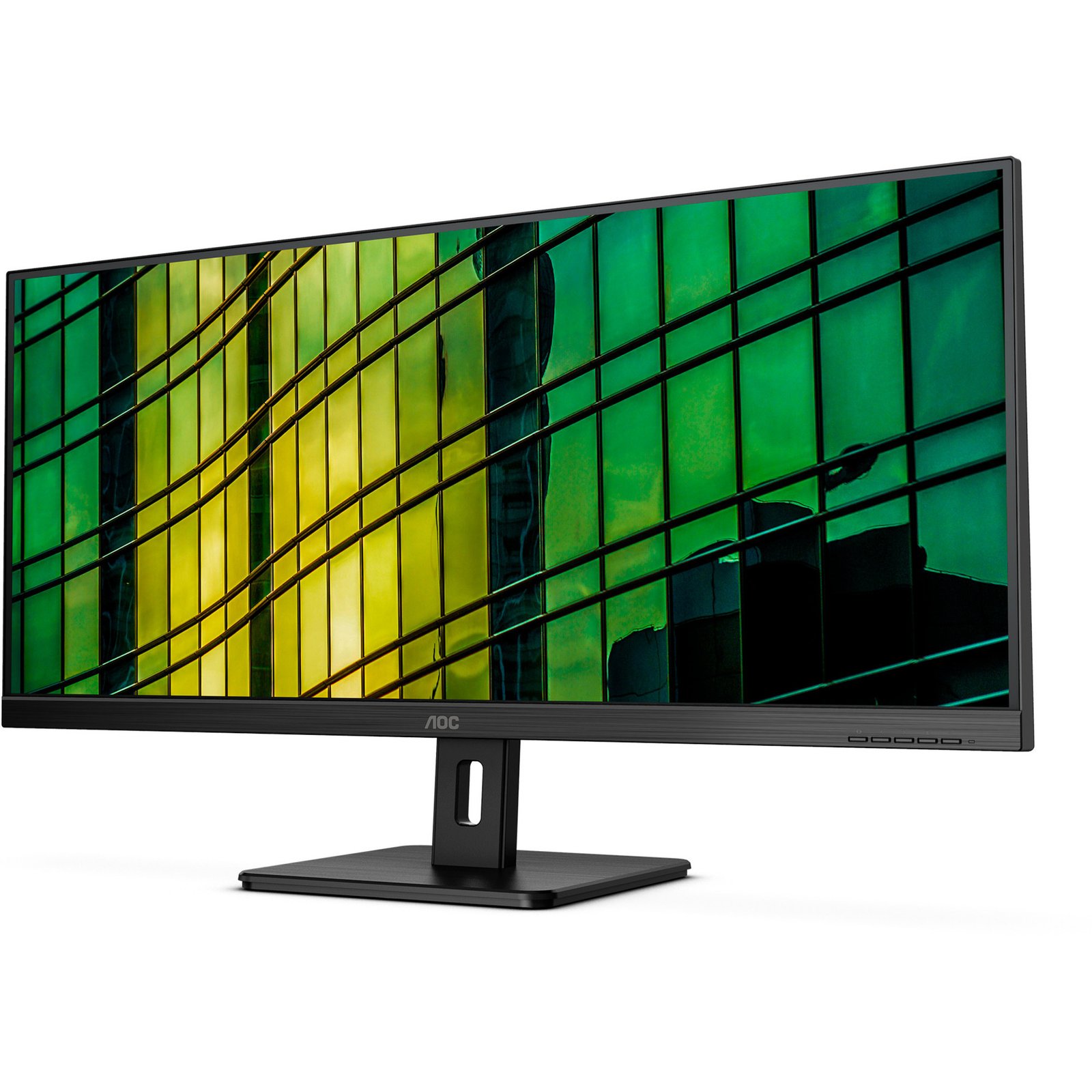 El AOC U34E2M tiene una pantalla impresionantemente grande con una diagonal de 86,4 cm (34″) y una resolución WQHD (3.440 × 1.440 píxeles) que casi no tiene bisel en tres lados. Gracias a la tecnología VA, la enorme superficie de trabajo muestra fácilmente el contenido desde ángulos de visión de hasta 178° con alto contraste y en el negro más profundo. Gracias a un filtro de luz azul y a la tecnología Flicker-Free, el U34E2M es agradable a la vista del usuario y evita daños durante el uso frecuente. El monitor inclinable funciona con una frecuencia de actualización de 100 Hz y tiene entradas para HDMI y DisplayPort.