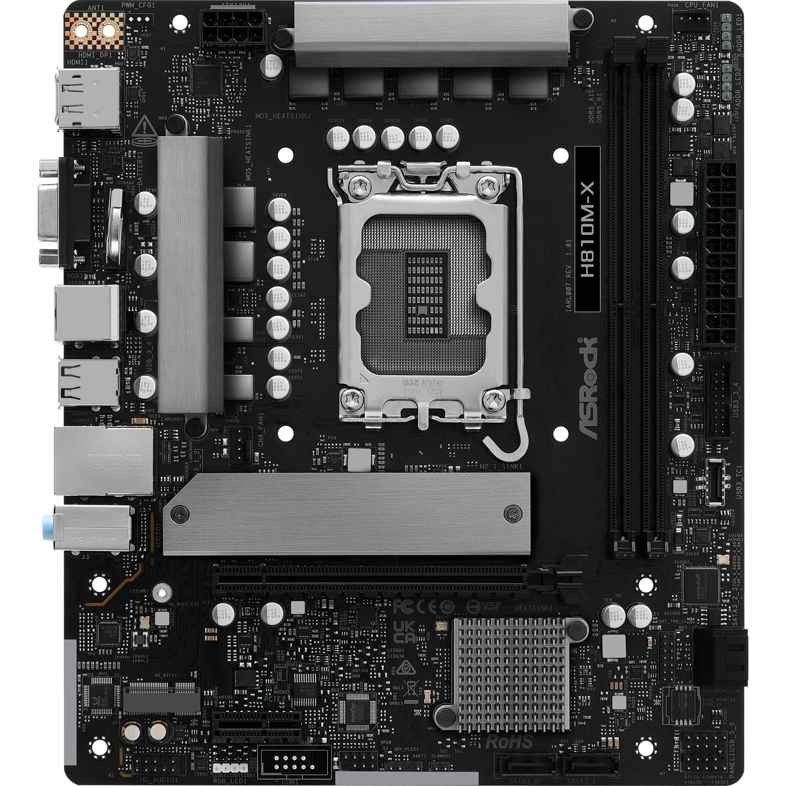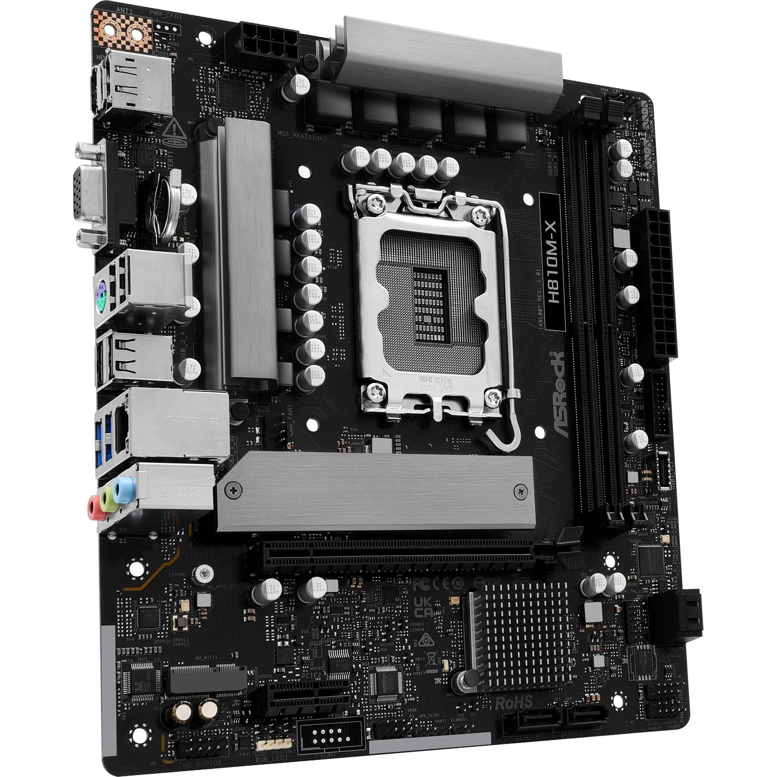 Das ASRock H810M-X basiert auf dem Intel®-H810-Chipsatz und unterstützt Intel®-Prozessoren für den Sockel 1851. Es verfügt über zwei DDR5-Slots für bis zu 128 GB Arbeitsspeicher. Zur weiteren Ausstattung des ASRock H810M-X gehört ein PCIe-4.0-x16-Slot und ein PCIe-4.0-x1 Slot. Außerdem verfügt das ASRock H810M-X über 8-Kanal-Sound, eine 2.5 Gigabit-LAN-Schnittstelle, vier SATA3-Anschlüsse, ein M.2-Anschluss und eine Reihe an USB-Schnittstellen.