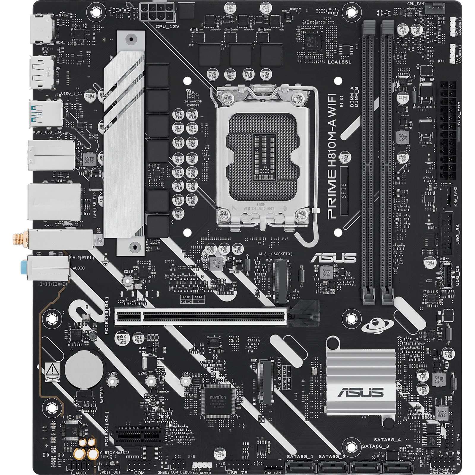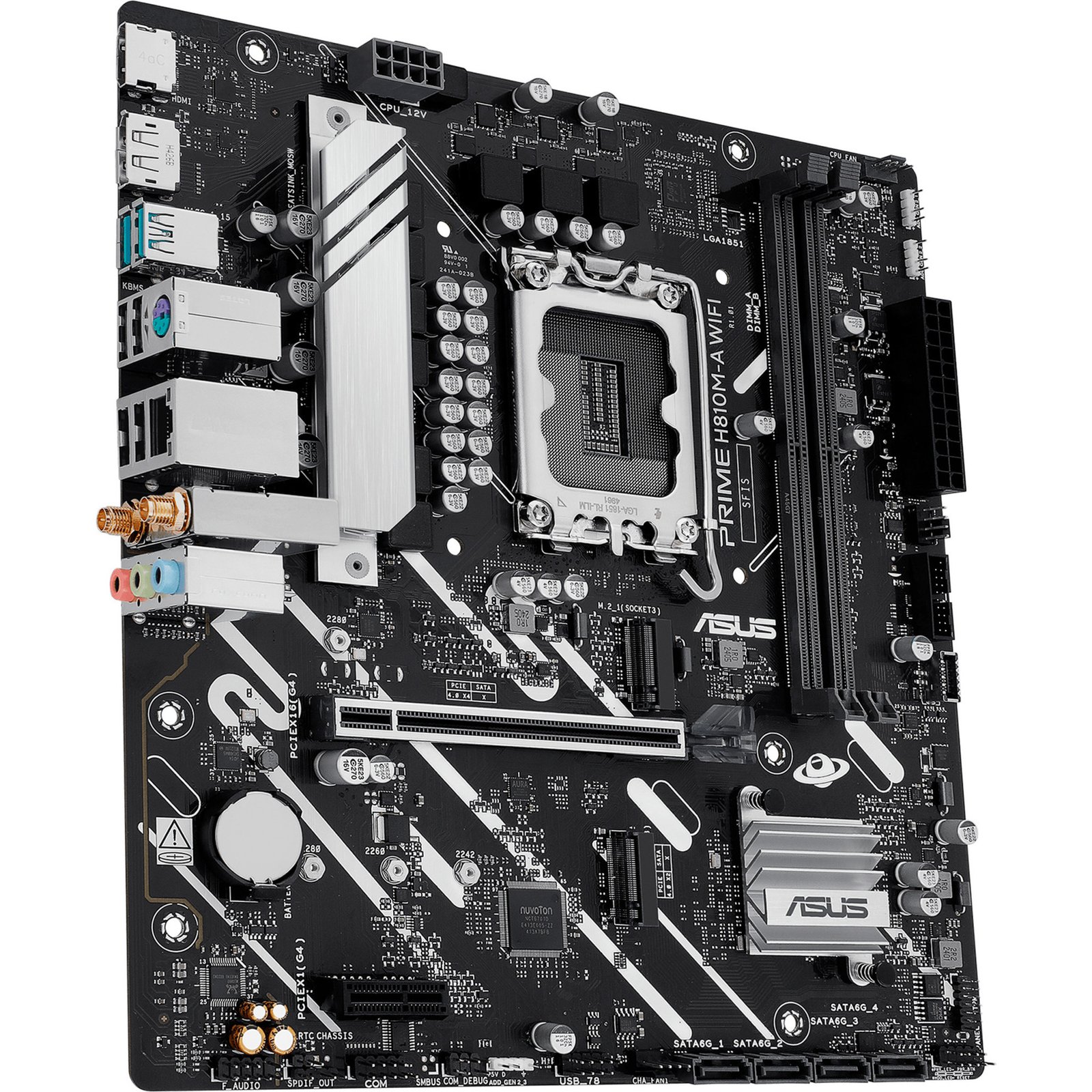 El ASUS PRIME H810M-A WIFI se basa en el chipset Intel® H810 y es compatible con procesadores Intel® para el socket 1851. Tiene dos ranuras DDR5 para hasta 128 GB de RAM. El ASUS PRIME H810M-A WIFI también tiene una ranura PCIe 4.0 x16 y una ranura PCIe 4.0 x1. Además, el ASUS PRIME H810M-A WIFI cuenta con sonido de 8 canales, una interfaz LAN Gigabit, cuatro puertos SATA3, Wi-Fi 6, Bluetooth 5.3, dos puertos M.2 y una gama de puertos USB.