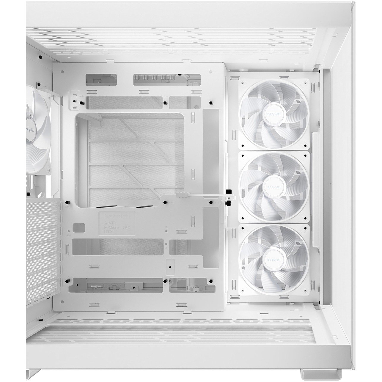 Light Base 600 DX White está hecha para la gran entrada. Nada lo demuestra mejor que la enorme tira de LED ARGB que es visible desde todos los ángulos. La tira de 1,33 m de largo consta de 77 LED. Con un control ARGB y la capacidad de sincronizar la iluminación con la placa base, puedes hacer de Light Base 600 DX White tu propia carcasa. Con sus pies extraíbles, literalmente puede invertir este estuche en segundos. También puedes colocarlo horizontalmente, que es igual de rápido. Light Base 600 DX viene sin ventiladores preinstalados. Sin embargo, puede instalar hasta 10 ventiladores. Gracias a su diseño espacioso, la carcasa también puede alojar hasta dos radiadores de 360 mm, una placa base ATX e incluso las tarjetas gráficas más potentes al mismo tiempo. Debido a su diseño de 2 cámaras, las unidades y los cables están inteligentemente montados en la parte posterior y permiten un fuerte flujo de aire. Además de los radiadores en la tapa y la parte inferior, puede instalar otro radiador de 240 mm en el lateral y, por lo tanto, unos increíbles 3 radiadores al mismo tiempo. Light Base 600 DX White tiene 2 concentradores ARGB y PWM con un total de 12 conectores. Sus posiciones en la parte superior e inferior de la carcasa le permiten conectar fácilmente su hardware. Light Base 600 DX viene con un soporte para tarjeta gráfica flexible que evita sutilmente que su tarjeta gráfica se hunda. Lo mejor de todo es que el soporte de la tarjeta gráfica funciona en todas las direcciones, tanto con las GPU instaladas horizontal como verticalmente.