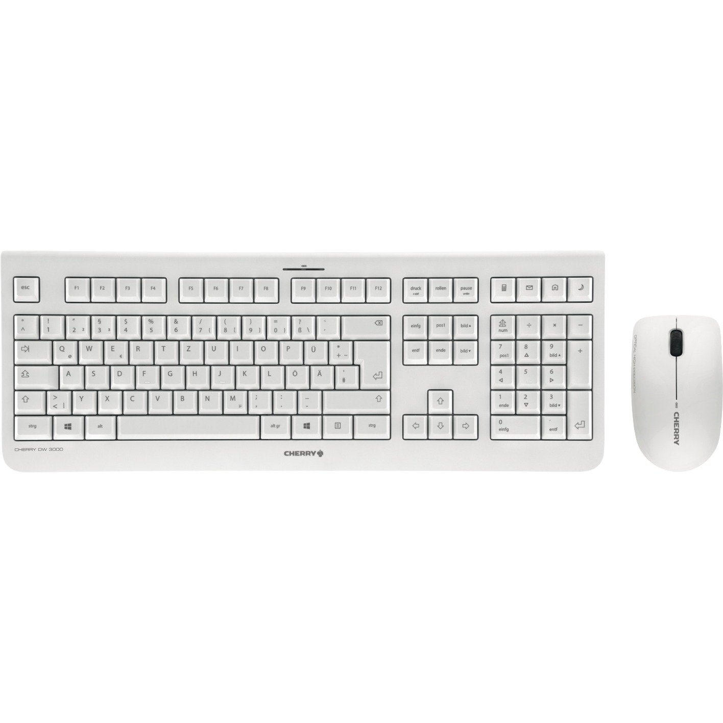 Das Desktop-Set Cherry DW 3000 besteht aus einer kabellosen Tastatur und Maus mit solider CHERRY-Technologie und hervorragendem Preisleistungsverhältnis. Die Tastatur überzeugt durch ihr modernes, flaches Design mit sanften, leisen und dauerhaft abriebfesten Tasten dank Laser-Tastenbeschriftung. Sie hat eine Lebensdauer von 10 Millionen Tastenanschlägen und stellt neben Cursor- und Nummernblock vier Hotkeys (Taschenrechner, E-Mail, Browser, Sleep-Modus) zur Verfügung. Der optische Sensor der Maus bietet eine Auflösung von 1.200 dpi und ist für Links- und Rechtshänder geeignet. Beide Geräte des DW 3000 Desktop-Sets verbinden sich mittels Plug & Play über den 2,4 GHz Nano USB-Empfänger und haben eine Reichweite von bis zu 10 Metern. Besonders praktisch ist die Batteriestatus-Anzeige in Tastatur und Maus.