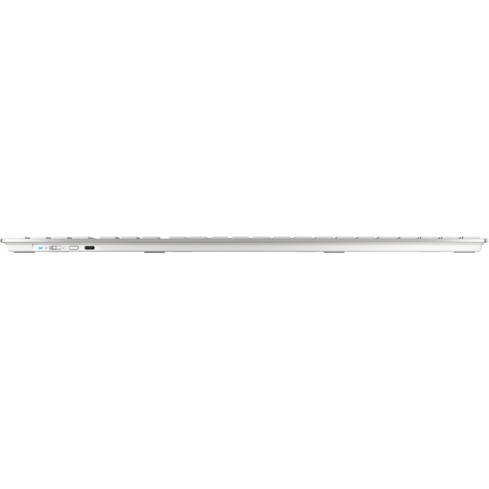 Beim Desktop-Set CHERRY DW 9100 SLIM treffen innovative Funktionen, herausragende Verarbeitung und sehr flaches Design aufeinander. Der Mix aus Ästhetik und optimalem Bedienkomfort ist eine Bereicherung für jeden modernen Schreibtisch. Mit einem Schalter an Tastatur und Maus lässt es sich blitzschnell zwischen den beiden Verbindungsarten Bluetooth und 2,4 GHz hin und her wechseln. Die Datenübertragung passiert in beiden Fällen über eine AES-128-Verschlüsselung mit bis zu 10 Metern Reichweite. Die wiederaufladbaren Lithium Akkus versorgen mit einem Ladevorgang das DW 9100 SLIM wochenlang mit Energie. Eine Metalplatte sorgt für maximale Stabilität und Standfestigkeit der Tastatur und die separate, magnetische Aufstellleiste ist binnen Sekunden montiert und sorgt somit für einen steileren Winkel. Die Basis für das ausgezeichnete Tippgefühl ist die hochwertige SX-Scherenmechanik mit definiertem und präzisem Druckpunkt ähnlich einer Notebooktastatur. Die kompakte Form der Maus bewirkt ein ideales Handgefühl, das sich sofort vertraut anfühlt. Ihre Auflösung ist 3-stufig über einen DPI-Schalter verstellbar und wechselt auf Knopfdruck zwischen 600, 1000 und 2400 dpi.