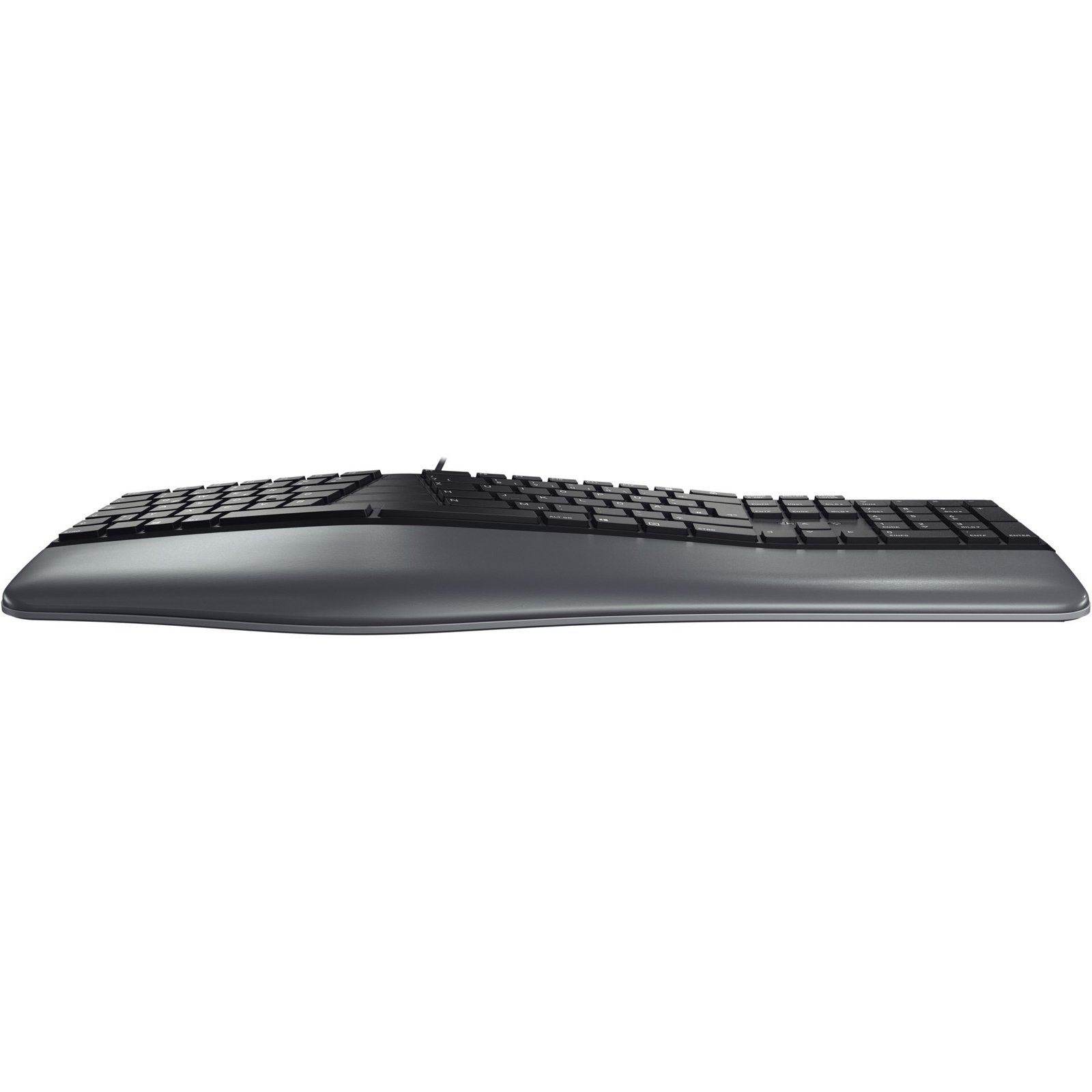 Die ergonomische Tastatur CHERRY KC 4500 ERGO kann Linderung bei durch eine falsche Körperhaltung verursachten Symptomen, wie verspannten Schultern, verschaffen. Durch die spezielle Bauform nehmen Hände und Arme von ganz allein eine natürlichere Haltung ein. Schultern und Rücken werden durch die entspannte Haltung entlastet und Stress wird reduziert. Die extra weiche Handballenauflage mit Memoryschaum verhindert Druckstellen und lässt die Hände bequem ablegen. Durch die drei stabilen Aufstellfüße kann die Tastatur auf der vorderen Seite erhöht werden, was vor allem beim Arbeiten im Stehen sehr angenehm ist. Die KC 4500 ERGO ist dank Plug & Play ohne weitere Software sofort einsatzbereit, kann jedoch auch mittels der kostenlosen CHERRY KEYS Software umfassend individualisiert werden, sodass Schnellzugriffe auf Apps, Dateien, individuelle Textbausteine oder Makros auf Tastendruck ermöglicht werden.