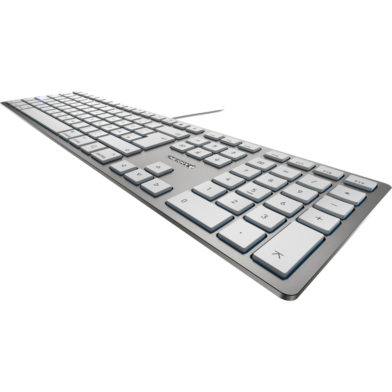 Die CHERRY KC 6000 SLIM FOR MAC ist eine Tastatur im Chiclet-Design mit Mac-Layout. Mit 12 Funktionen ausgestattet (wie beispielsweise Bildschirm sperren, Bildschirmhelligkeit, Mission Control und Mediensteuerung ), erleichtert sie den täglichen Umgang mit einem Mac und sorgt dank des Ziffernblocks für eine komfortabel Zahleneingabe. Die nahezu geräuschlose SX-Schaltertechnik bietet ein hervorragendes Schreibgefühl und eine lange Lebensdauer mit bis zu 10 Millionen Tastenanschlägen. Durch eine eingebaute Metall-Platte liegt die KC 6000 SLIM FOR MAC stabil und rutschsicher auf dem Schreibtisch, wo sie dank ihrer kompakten Abmessungen genügend Freiraum für andere Utensilien lässt. Die KC 6000 SLIM FOR MAC ist mit ihrem silbernen Gehäuse und den weißen Tasten die ideale und stilbruchfreie Tastaturalternative für Vielschreiber am Mac.