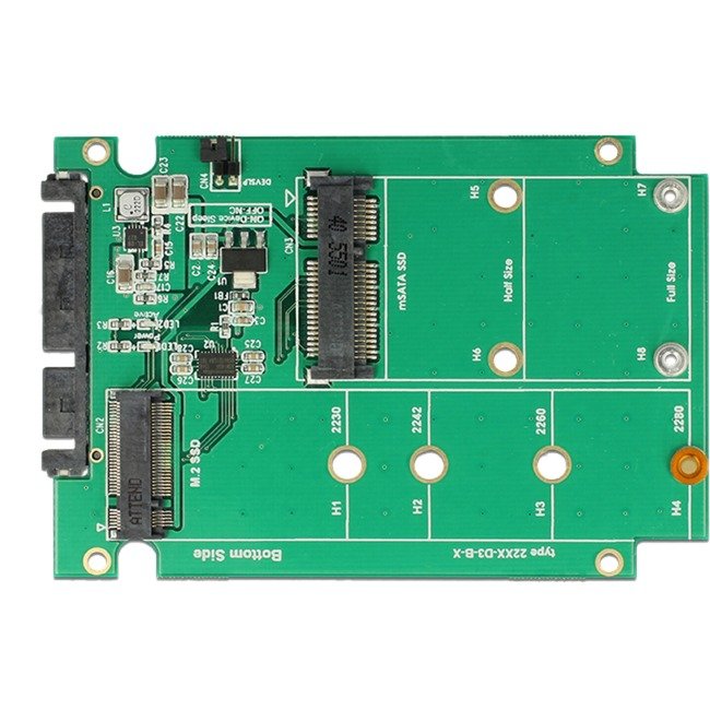 Este convertidor de Delock permite la conexión de una unidad de estado sólido SATA M.2 con el formato 2280, 2260, 2242 y 2230 o un módulo mSATA de tamaño medio o tamaño completo. Si ambas ranuras están ocupadas, solamente se puede utilizar la unidad de estado sólido M.2. El convertidor se puede instalar en un sistema mediante la interfaz SATA de 22 contactos.