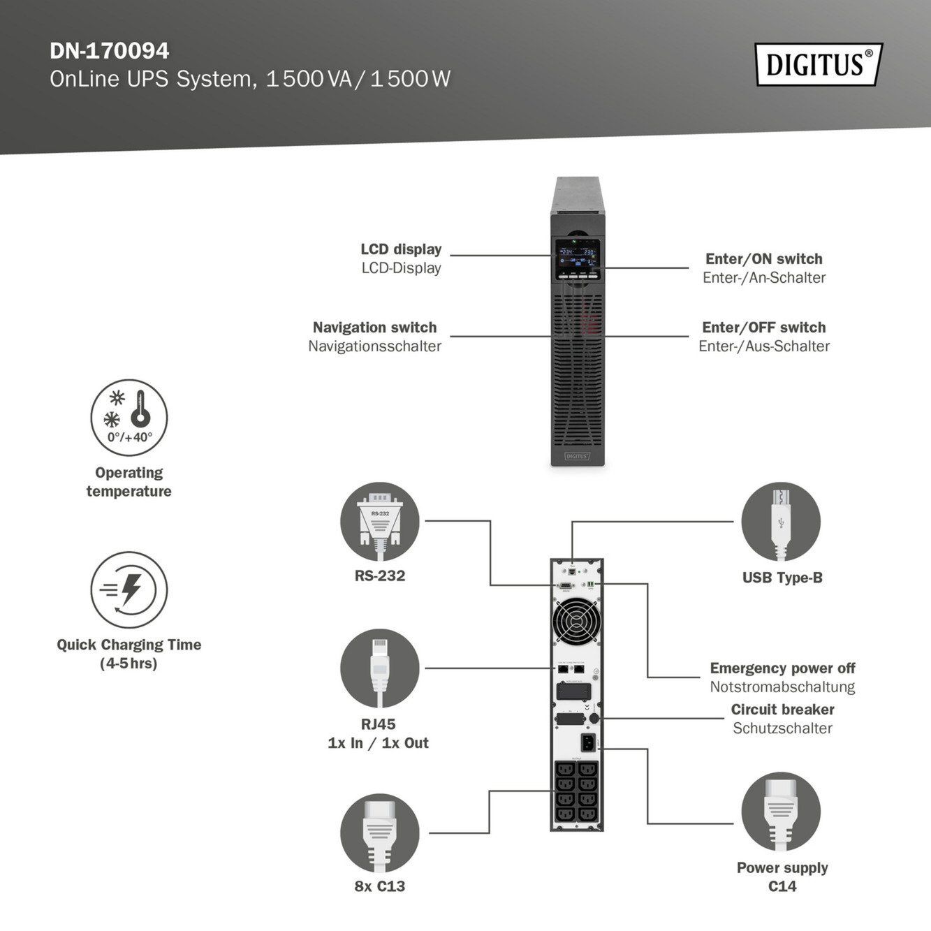 Die DIGITUS Online USV ist eine Doppelwandler USV-Lösung, die erstklassigen Stromausfallschutz und kontinuierliche Stromerzeugung in einem kompakten und flexiblen System bietet. Die einphasige USV arbeitet mit hoher Energieeffizienz und ist ideal zum Schutz kritischer Infrastrukturen sowohl in zentralisierten als auch in Edge-Netzwerkanwendungen geeignet. Skalierbare Laufzeitoptionen mit passenden externen Batterieschränken bieten zusätzliche Flexibilität, wenn eine längere unterbrechungsfreie Stromversorgung erforderlich ist. Das benutzerfreundliche LCD-Display sowie die Netzwerkmanagementfähigkeit, einschließlich Konfiguration, machen dieses System einfach zu installieren und zu warten. Mit marktführender Effizienz und einheitlichem Leistungsfaktor erfüllt der USV Ihre kritischen Anwendungsanforderungen.