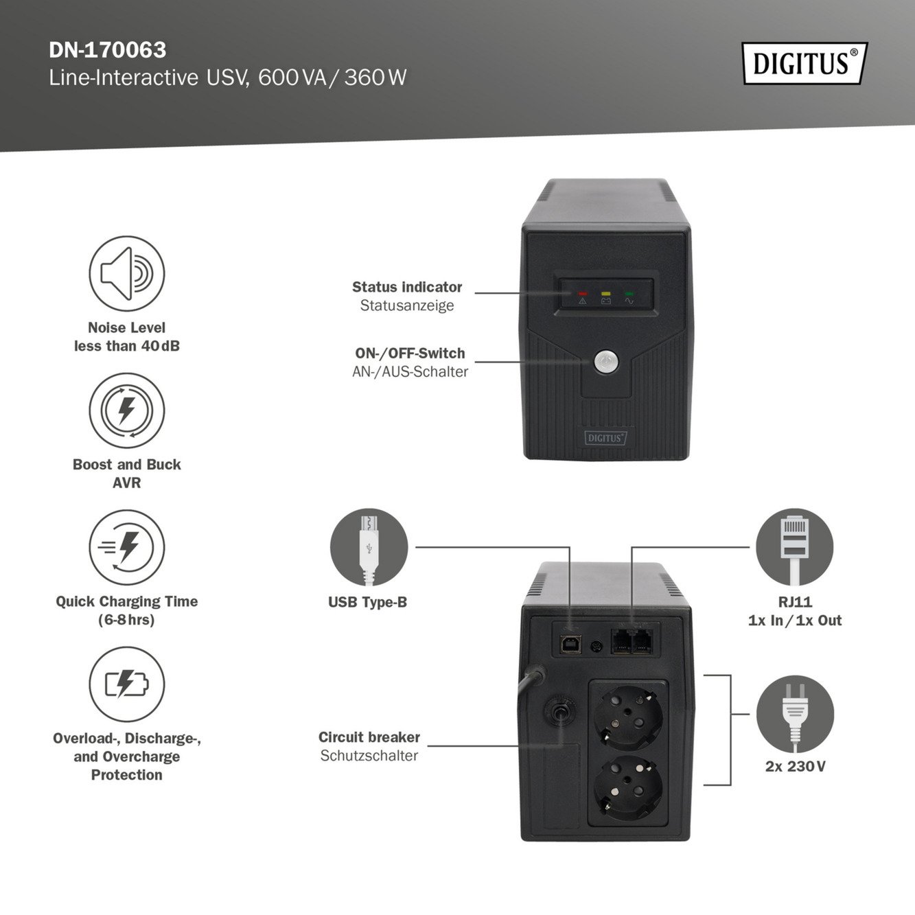Die DIGITUS Line-Interaktiv USV Anlagen sorgen für unterbrechnungsfreie Stromversorgung in einer kompakten Größe und mit einer exzellenten Mikroprozessor-Kontrolle, welche eine hohe Verlässlichkeit bietet. Schützen Sie Ihre Büro- oder Geschäftsausstattung gegen Datenverlust und Schäden durch Fehler im Stromnetz oder Stromausfälle. Die USV Geräte sind einfach zu handhaben und bieten ein Höchstmaß an Performance und Sicherheit. Features wie z.B. der Überlast-, Entladungs- und Überladungsschutz, eine Kaltstartfunktion und Energiespareigenschaften sowie ein akustisches Alarmsystem, sind nur einige Vorteile der DIGITUS Line-Interactive USV Anlagen.