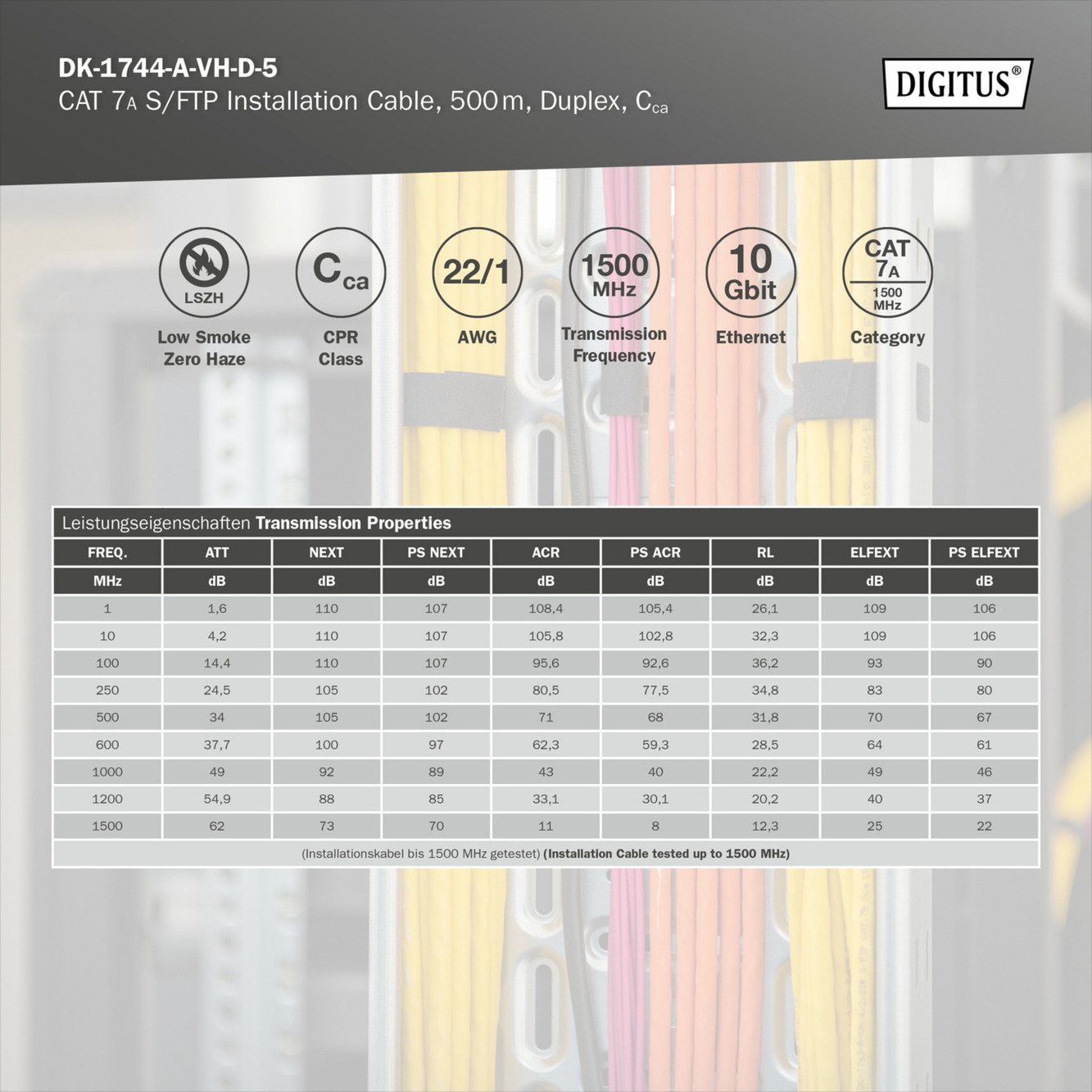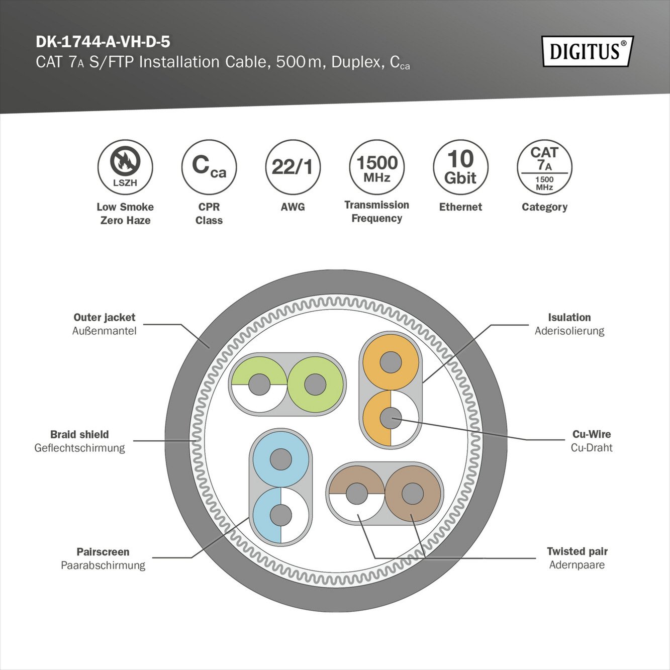 Das Digitus Professional Cat.7a S/FTP Verlegekabel DK-1744-A-VH-D-5 zeichnet sich durch einen 4×2 AWG 22/1 Kabelaufbau aus und erreicht eine Übertragungsfrequenz von bis zu 1.500 MHz. Der Kabelmantel ist halogenfrei und konform zu der BauPVO Euroklasse Cca. Das Verlegekabel ist für den Einsatz im strukturierten Rechenzentrum und der Gebäudeverkabelung konzipiert. Es eignet sich hervorragend für die Übertragung von analogen und digitalen Daten, es unterstützt POE und POE+. Der Schirmaufbau setzt sich aus einzelgeschirmten Paaren mit einem verzinnten Kupfergeflecht zusammen, die eine exzellente Schirmung und elektrische Werte gewährleisten. Außerdem verfügt es über hervorragende mechanische Eigenschaften, es bietet eine Zugbelastung von max. 150N, der dynamische Biegeradius beträgt min. 8x AD mm, der statische Biegeradius min. 4x AD mm.