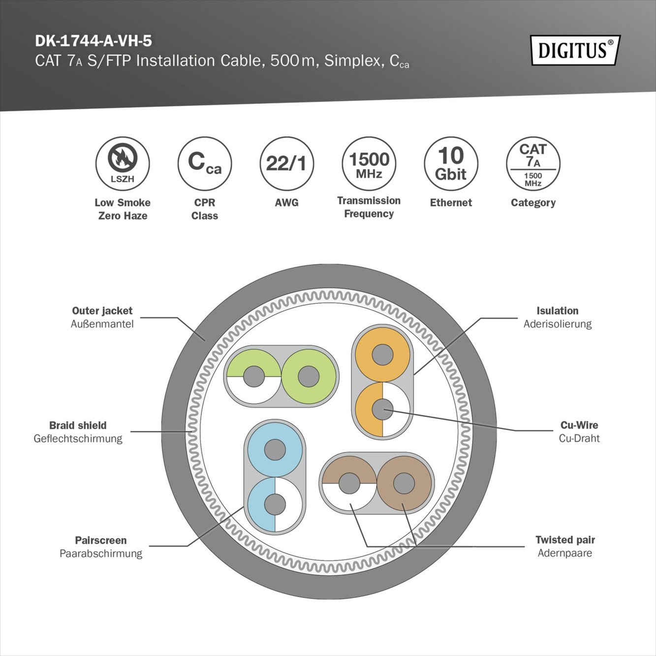Das Digitus Professional Cat.7a S/FTP Verlegekabel DK-1744-A-VH-5 zeichnet sich durch einen 4×2 AWG 22/1 Kabelaufbau aus und erreicht eine Übertragungsfrequenz von bis zu 1.500 MHz. Der Kabelmantel ist halogenfrei und konform zu der BauPVO Euroklasse Cca. Das Verlegekabel ist für den Einsatz im strukturierten Rechenzentrum und der Gebäudeverkabelung konzipiert. Es eignet sich hervorragend für die Übertragung von analogen und digitalen Daten, es unterstützt POE und POE+. Der Schirmaufbau setzt sich aus einzelgeschirmten Paaren mit einem verzinnten Kupfergeflecht zusammen, die eine exzellente Schirmung und elektrische Werte gewährleisten. Außerdem verfügt es über hervorragende mechanische Eigenschaften, es bietet eine Zugbelastung von max. 150N, der dynamische Biegeradius beträgt min. 8x AD mm, der statische Biegeradius min. 4x AD mm.