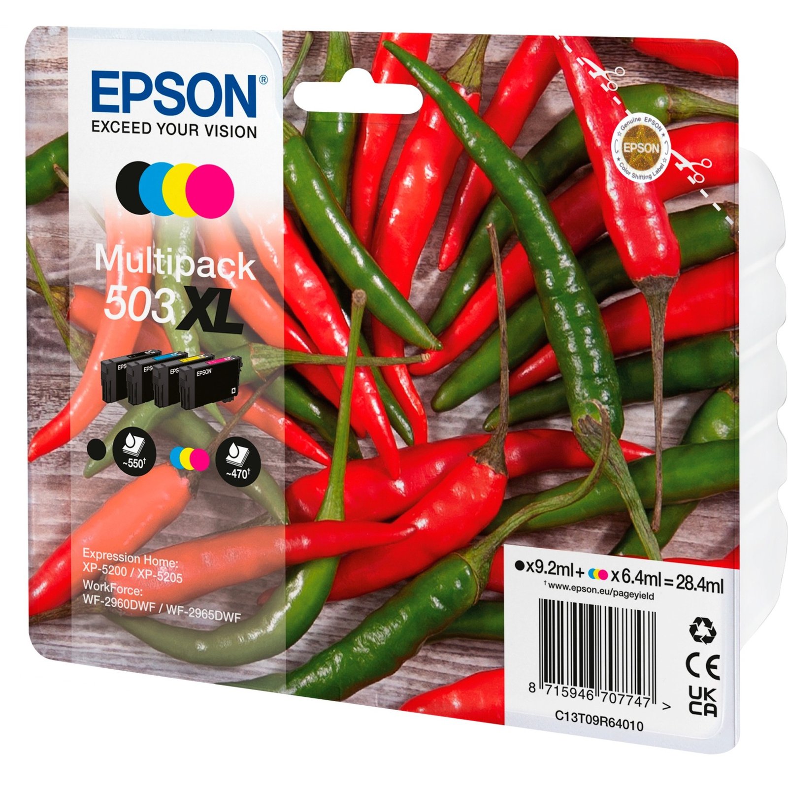 La tinta Multipack 503 XL (C13T09R64010) es un consumible original de Epson. Este juego de tintas contiene un total de 28,4 ml de tinta en cuatro cartuchos XL: 1x 9,2 ml negro y 1x 6,4 ml cada uno con los colores cian, magenta y amarillo. Este conjunto es adecuado para los modelos Epson Expression Home XP-5200 y Epson WorkForce WF-2960DWF.