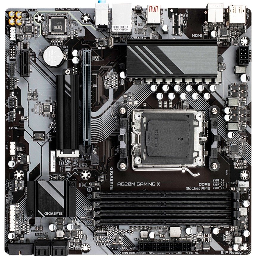 El A620M GAMING X de GIGABYTE está basado en el chipset AMD A620 y soporta procesadores AMD para el zócalo AM5. Tiene cuatro ranuras DDR5 para hasta 128 GB de RAM. El A620M GAMING X de GIGABYTE también cuenta con una ranura PCIe 4.0 x16 y una ranura PCIe 3.0 x1. Además, el A620M GAMING X de GIGABYTE tiene sonido de 8 canales, una interfaz LAN Gigabit, cuatro puertos SATA3, un puerto M.2 y varias interfaces USB.