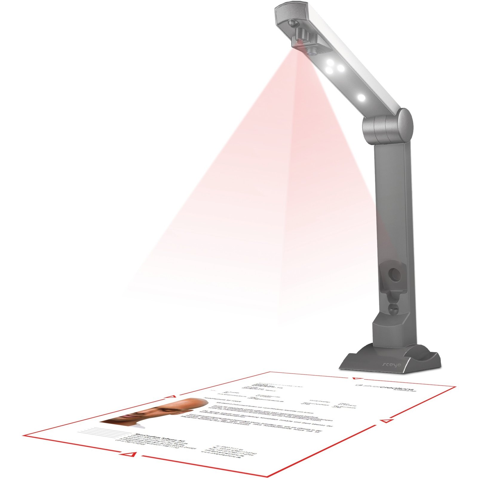 Diseño innovador y alta funcionalidad caracterizan al SceyeX A4 con PRIMEflash. Este escáner de cámara captura documentos, tarjetas en relieve, tarjetas de identificación o fotos en segundos a medida que se leen, hasta un tamaño de plantilla de 302 x 226 mm. El dispositivo toma una instantánea, alinea la imagen directamente y la corta automáticamente, sin la necesidad de una acción del mouse o el teclado. El PRIMEflash integrado en el brazo garantiza una luz sin reflejos y resultados nítidos con una resolución de 10 megapíxeles. Los documentos escaneados se pueden guardar como PDF (también se puede buscar), TIFF y JPEG. El dispositivo funciona completamente en silencio.