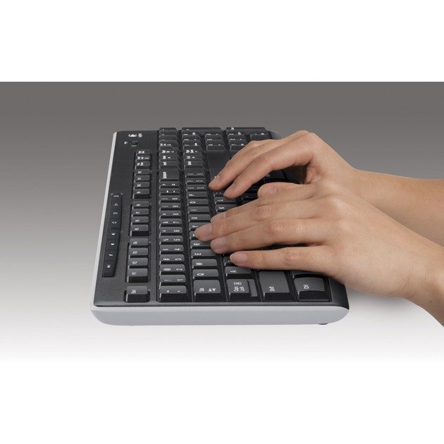 Das Logitech Wireless Keyboard K270 wird mit einem winzigen Unifying-Empfänger geliefert, der ständig in einem Notebook eingesteckt bleiben kann ohne beschädigt zu werden, selbst wenn man es transportiert. Und über denselben Empfänger kann man weitere Geräte hinzufügen. Das elegante Wireless Keyboard K270 spart Platz, ohne Zugeständnisse beim Komfort zu machen – mit vertraut angeordneten Tasten in Standardgröße inklusive Nummernblock und einer breiten und leicht gewölbten Leertaste. Über acht Sondertasten hat man sofortigen Zugriff auf Musik, E-Mail-Programm und vieles mehr. Aufgrund der speziellen Beschichtung verblassen die Tasten nicht, sodass man auch nach Jahren sieht, was man tippt. Dank der intelligenten Energieverwaltung halten die Batterien jahrelang. Die Einrichtung ist eine Frage von Sekunden: einfach den kabellosen Empfänger in einen USB-Anschluss des Computers einstecken und schon ist die Tastatur einsatzbereit – ganz ohne Software. Dank des Spritzwasserschutzes können Flüssigkeiten vom Wireless Keyboard K270 ablaufen – bei versehentlichem Verschütten besteht daher kein Grund zur Sorge.
