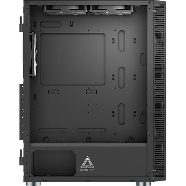 El Montech X3 no es una carcasa para juegos de PC cualquiera, es una mejora en todos los sentidos en comparación con las carcasas anteriores de la serie X. Los tres ventiladores delanteros de 140 mm del Montech X3 proporcionan una gran entrada de aire y optimizan el sistema de flujo de aire con las rejillas de ventilación superior y trasera premontadas. Los seis ventiladores preinstalados están equipados con iluminación RGB fija. Puede encender o apagar la iluminación del ventilador simplemente presionando el botón LED. El diseño único de los paneles laterales giratorios laterales de vidrio templado no solo facilita el desmontaje del usuario, sino que el diseño sin orificios también mejora en gran medida la resistencia, integridad y seguridad del panel.