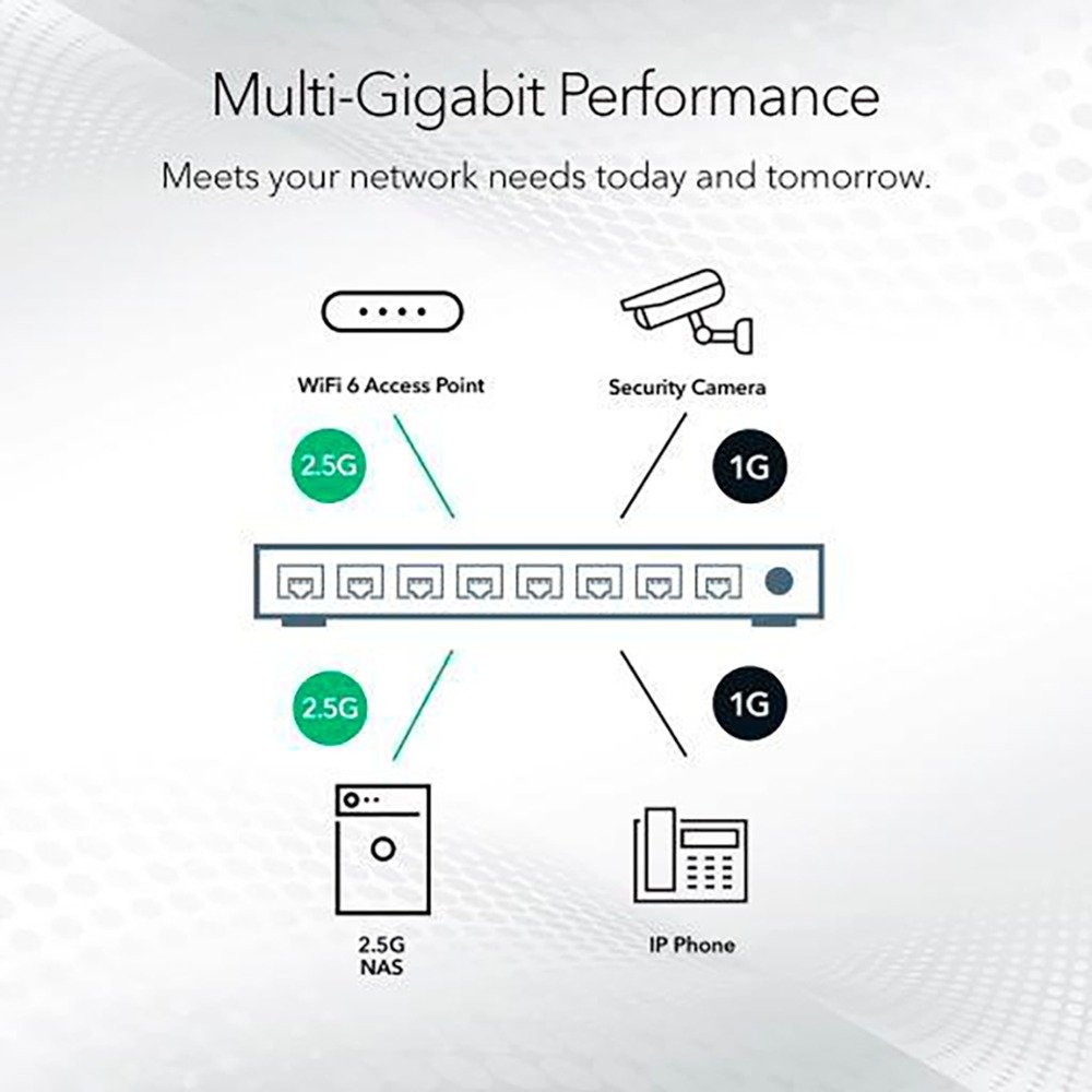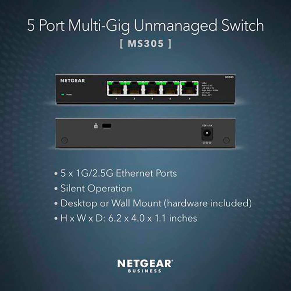 El conmutador no gestionado multigigabit de 5 puertos MS305 de Netgear ayuda a las organizaciones a ampliar sus redes de forma rentable con velocidades de varios gigabits. El conmutador Gigabit Ethernet MS305 cuenta con cinco (5) puertos 2.5G en una carcasa metálica y se puede colocar en un escritorio o montarse en la pared con el kit de montaje en pared incluido. Este conmutador es energéticamente eficiente, está construido para durar y se ha probado al máximo para proporcionar la fiabilidad que las empresas necesitan. La priorización del tráfico 802.1p y la compatibilidad con tramas gigantes permiten una integración perfecta en redes más complejas