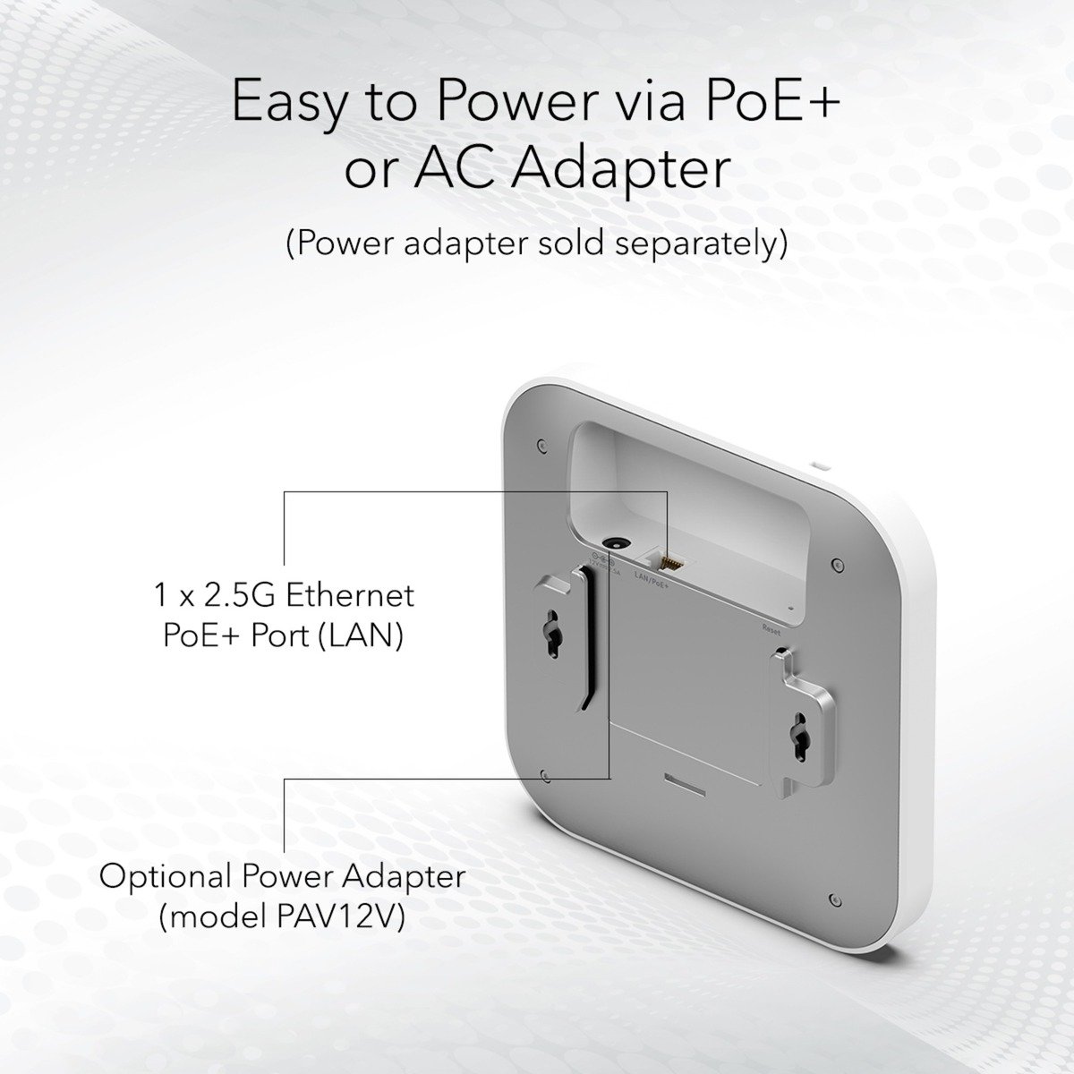 4 GHz, 5 GHz, Rango máximo de transferencia de datos: 1800 Mbit/s. Algoritmos de seguridad soportados: EAP-PEAP, EAP-TLS, EAP-TTLS, PEAP, SSH, SSL/TLS, WPA, WPA2, WPA2-Enterprise, WPA3. Ethernet LAN, velocidad de transferencia de datos: 10,100,1000,2500 Mbit/s. Energía sobre Ethernet (PoE). Color del producto: Blanco
