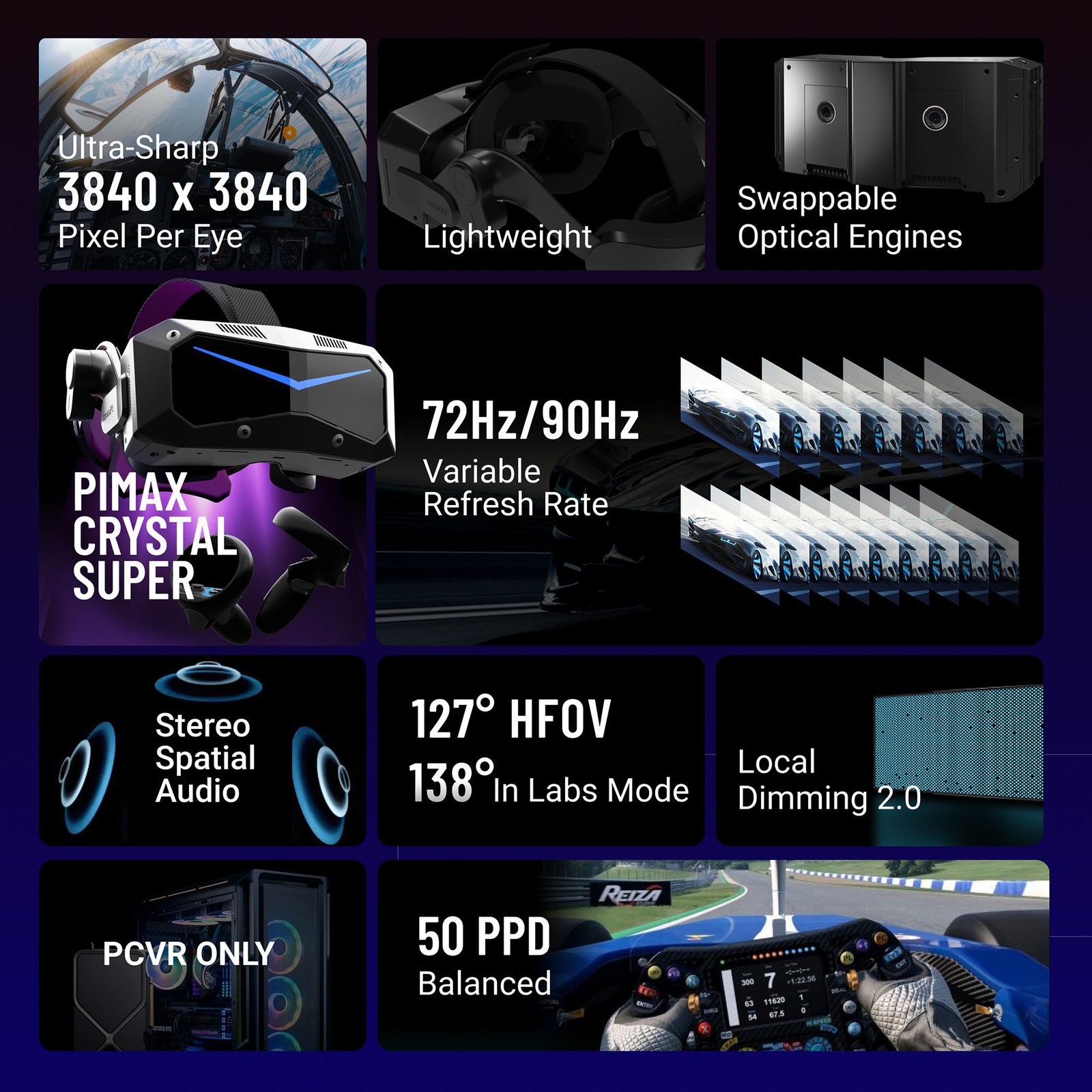 Die Crystal Super 50PPD von Pimax ist hochmodernes VR-Headset mit ultrahoher Auflösung von 3840 x 3840 Pixeln pro Auge und asphärischen Glaslinsen für ein besonders klares Bild und einen großen Sweet Spot.Das Sichtfeld erreicht 50 PPD bei 127° und bis zu 138° im erweiterten Labs-Modus. Eine variable Bildwiederholrate von 72 Hz oder 90 Hz sorgt für flüssige Darstellungen, auch bei schnellen Bewegungen. Die automatische IPD-Anpassung im Bereich von 58 bis 72 mm ermöglicht optimalen Komfort und präzise Bildausrichtung. Lokales Dimming sorgt für realistische Farben und tiefe Kontraste. Das Dynamic 2.0 Foveated Rendering optimiert die Leistung, indem es die Rechenleistung auf den Blickfokus konzentriert. Im Lieferumfang enthalten sind zwei Controller. Das Headset nutzt Inside-Out-Tracking für eine einfache Einrichtung ohne externe Sensoren, kann aber bei Bedarf mit Lighthouse-Tracking erweitert werden. Für Audio steht ein austauschbarer 3,5-mm-Klinkenanschluss zur Verfügung, ergänzt durch zwei integrierte Mikrofone.