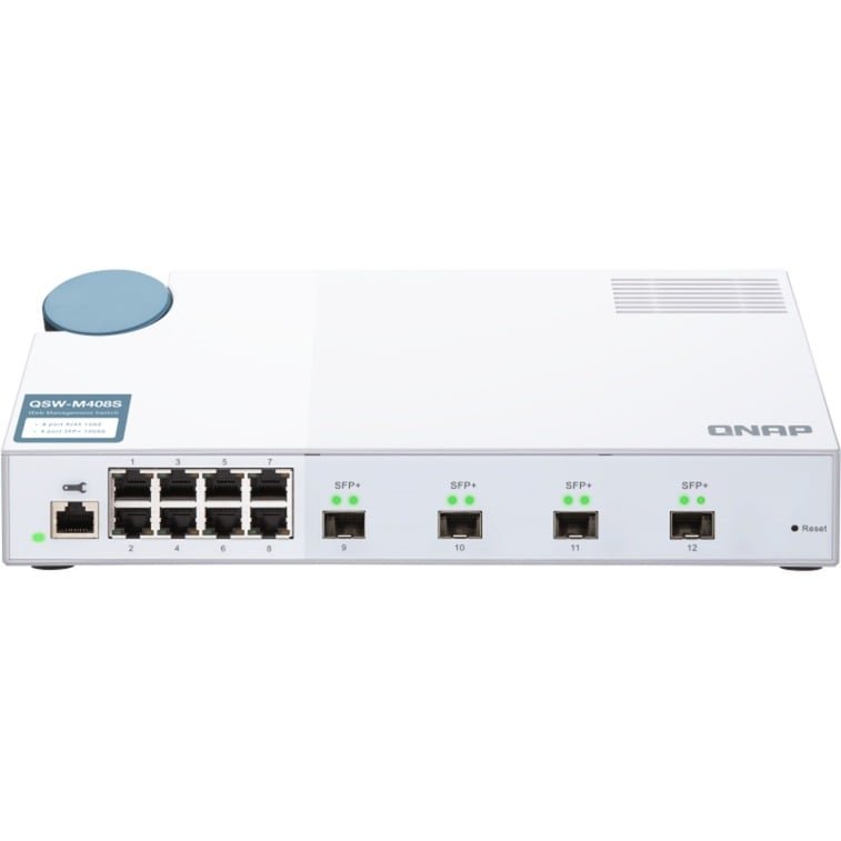 El QSW-M408S es un Switch Gestionable por web de Capa 2 que cuenta con cuatro puertos 10GbE SFP+ y ocho puertos Gigabit. Admite conmutación de Capa 2 y gestión de red a través de una interfaz de usuario web fácil de usar. El QSW-M408S ofrece una implementación flexible en entornos de red híbrida de alta velocidad y proporciona una solución de gestión de red de nivel básico que pueden utilizar incluso profesionales que no se dedican al sector TI. Gracias a su alto rendimiento, funciones de administración fáciles de usar y tamaño de escritorio, con el QSW-M408S puede actualizar al instante a un entorno de red híbrido de alta velocidad a un precio asequible, a la vez que optimiza el ancho de banda de la red y garantiza la seguridad del mantenimiento de la red.Implementación flexible con varios puertos Gigabit y fibra 10G SFP+El QSW-M408S proporciona cuatro puertos 10GbE SFP+ y ocho puertos Gigabit para conectar varios dispositivos y habilitar redes híbridas de alta velocidad. Con las interfaces SFP+, se pueden utilizar cables de cobre de conexión directa (DAC) para conectar directamente a dispositivos SFP+. También puede utilizar módulos de transceptor de cobre 10G-SFP-T para conectar dispositivos 10GBASE-T/NBASE-T™ a través del cableado RJ45 de Categoría 6, 5 o 5e. La capacidad de conmutación del QSW-M408S es de 96 Gbps, lo que garantiza el máximo potencial de cada puerto.QSS: Software intuitivo de gestión de red con GUI webEl QSW-M408S utiliza el QNAP Switch System (QSS), que dispone de una GUI web fácil de usar con funciones de valor añadido para simplificar la configuración y la gestión de red.QSS: Guía de configuración centrada en la personaQNAP Switch System (QSS) cuenta con un panel de información general, administración de puertos y guía de configuración para que los administradores puedan controlar las redes de Capa 2.Optimice el rendimiento de la red con control de paquetes y ancho de bandaEl QSW-M408S cuenta con funciones de control de paquetes y ancho de banda (como LACP, VLAN, QoS e IGMP Snooping) para aumentar el rendimiento de la red a través de la agrupación de IP y la gestión del ancho de banda.Funciones avanzadas de seguridad y sistemaEl QSW-M408S cuenta con funciones avanzadas de seguridad y sistema (que incluyen ACL, LLDP, RSTP y control de flujo) para que los administradores disfruten de una red más fiable gracias a los controles de acceso, la resolución de problemas, la prevención de bucles y el evitar la pérdida de paquetes.Mejore la productividad del equipo con una red de alta velocidad de 5GbE/10GbEDesde dispositivos NAS con puertos 10GbE SFP+ y 10GBASE-T integrados, o NAS con ranuras PCIe que admiten adaptadores de red 10GbE/5GbE/2,5GbE, QNAP ha sido un pionero en el sector en la adopción de 10GbE. Otras soluciones de red de alta velocidad de QNAP incluyen adaptadores de red Thunderbolt 3 a 10GbE y adaptadores de red USB 3.2 Gen 1 a 5GbE. Estos se pueden utilizar con el QSW-M408S para crear un entorno integral de red de alta velocidad y de ese modo mejorar el rendimiento de la edición de foto/vídeo, virtualización, transferencias de datos de archivos de gran tamaño y otras tareas que requieren ancho de banda.El tamaño del escritorio facilita su uso en oficinasCon un diseño compacto y moderno, QSW-M408S se adapta perfectamente a otros dispositivos en oficinas digitales modernas. Con un fino diseño de superficie blanca o texturizada, QSW-M408S ayuda a los usuarios a identificar cada puerto de forma sencilla. El conector de alimentación de CC flexible también ayuda a implementar el QSW-M408S a nivel global. Al ser completamente Plug and Play, solo tiene que conectar el QSW-M408S a sus dispositivos y olvidarse.