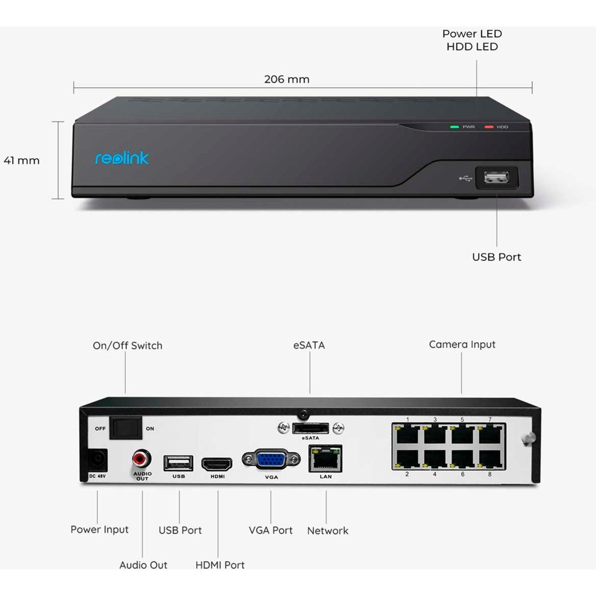 El NVR PoE de 8 canales Reolink NVS8 funciona con todas las cámaras IP Reolink de 12 MP, 10 MP, 8 MP, 5 MP o 4 MP (no cámaras alimentadas por batería o alimentadas por batería) para permitir la grabación durante todo el día, detección de movimiento, visualización en vivo, reproducción y otras funciones, lo que permite grabación 24/7, detección de movimiento, visualización en vivo, reproducción y otras funciones. El NVR Reolink es la solución óptima cuando se van a utilizar varias cámaras IP o cuando la grabación y el monitoreo se deben llevar a cabo durante todo el día.
