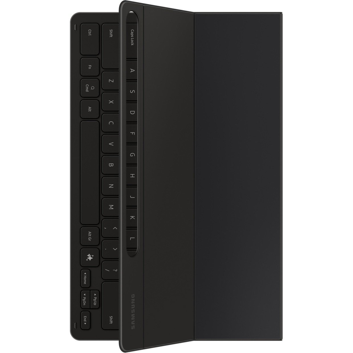 El teclado Book Cover Slim de una sola pieza de SAMSUNG con teclado QWERTZ completo y conexión a través de un pin POGO encaja perfectamente en el Samsung Galaxy Tab S10+ | S9+ | S9 FE+. Con el botón de IA, puede acceder al asistente impulsado por IA: simplemente toque el botón correspondiente y deje que el asistente de IA procese la solicitud. El teclado con teclas de función combinado con el modo DeX permite una experiencia similar a la de una PC con solo una simple pulsación de tecla. Con Wireless Keyboard Sharing, puedes conectarte fácilmente a otros dispositivos Galaxy compatibles y cambiar, escribir o navegar fácilmente en ellos. Delgado y liviano, el teclado Book Cover Slim se adhiere rápida y fácilmente usando los imanes en la parte posterior de la cubierta. También tiene una opción de almacenamiento adicional para el S Pen (se vende por separado), para que puedas tenerlo rápidamente a mano y no se pierda tan rápido.
