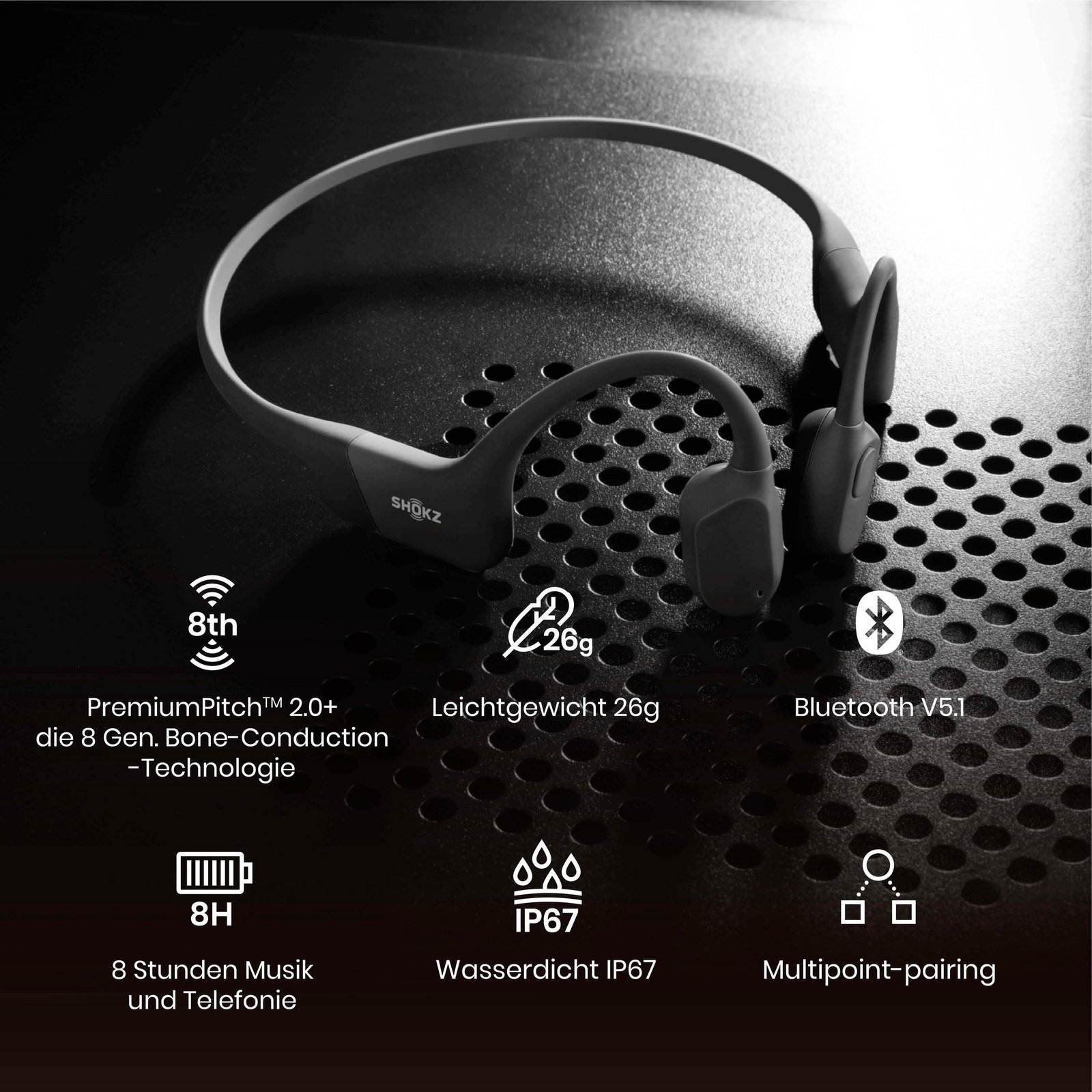 Los Shokz OpenRun ofrecen una función de carga rápida y están listos para su uso hasta 1,5 horas después de solo 10 minutos. El diseño de oído abierto significa que el entorno sigue siendo perceptible sin comprometer la calidad del sonido de los auriculares. La tecnología PremiumPitch 2.0+ ofrece una amplia gama de sonido estéreo dinámico, y el OpenRun tiene protección IP67 contra salpicaduras, sudor y lluvia. Con el chip Bluetooth 5.1, los micrófonos duales con cancelación de ruido ambiental y el algoritmo CVC para separar nítidamente la voz del ruido ambiental, las conversaciones sobre la marcha siempre son claramente inteligibles.