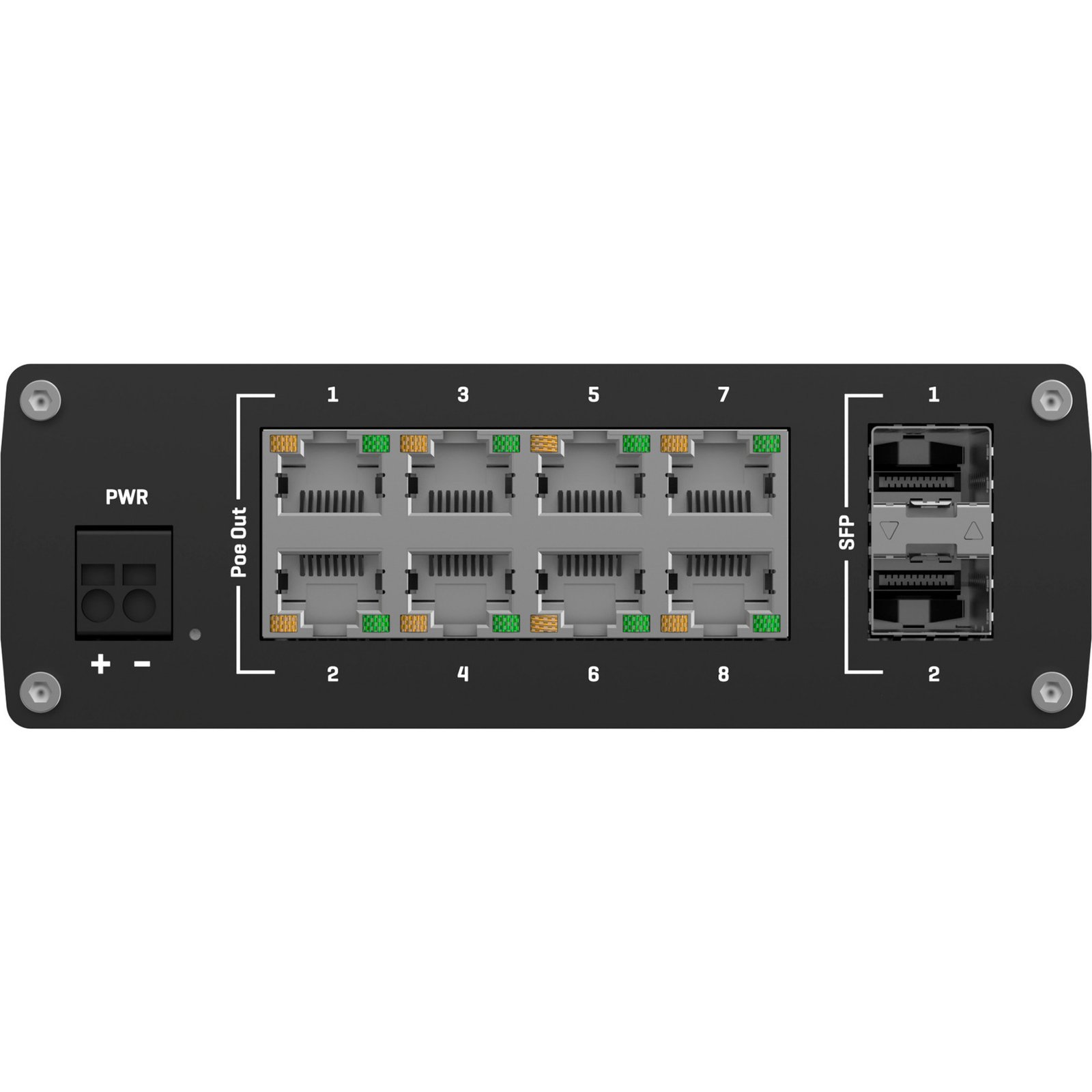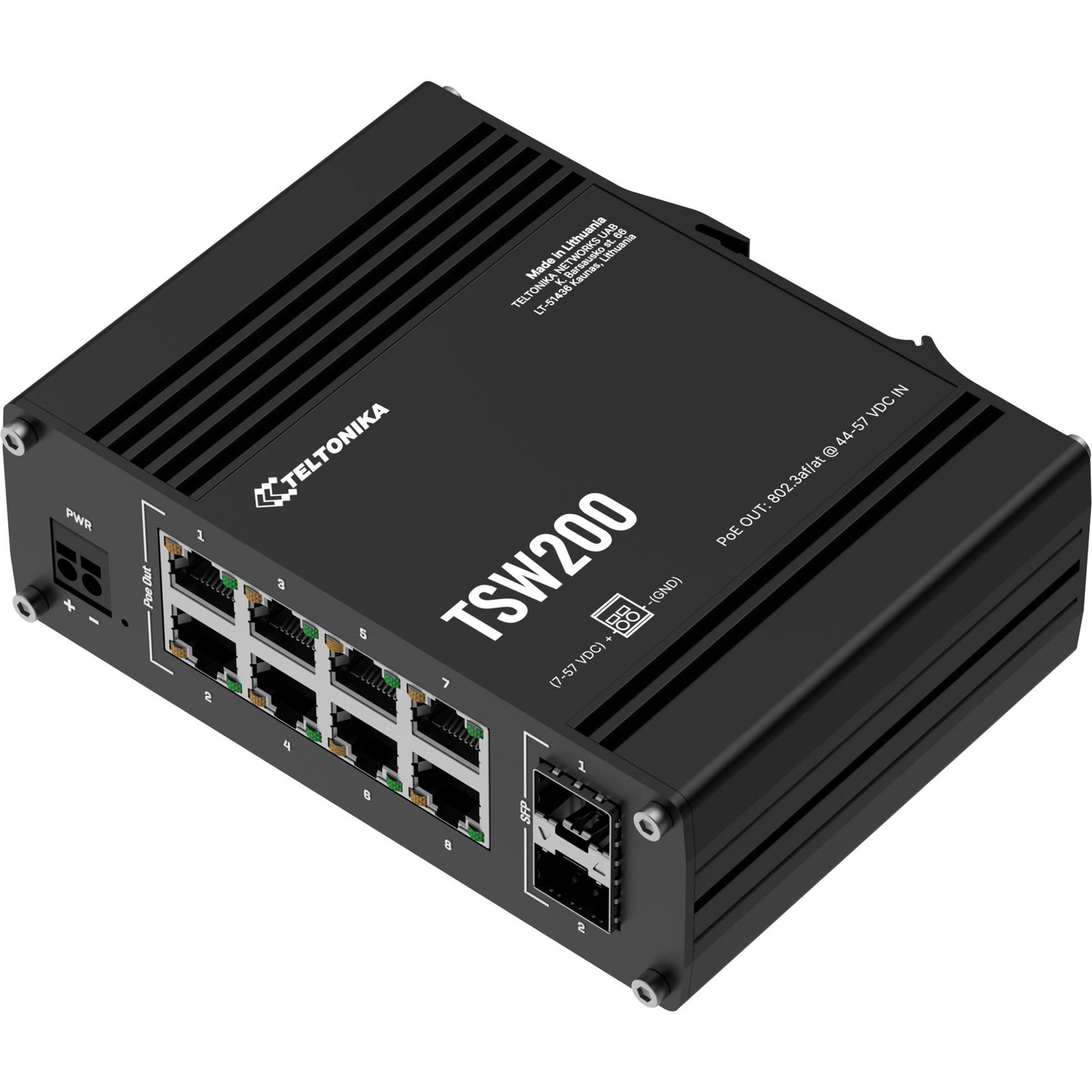 Der Teltonika TSW200 ist ein industrieller POE+-Ethernet-Switch. Der TSW200 ist mit 2 SFP-Anschlüssen für Glasfaserkommunikation mit großer Reichweite und mit 8 Gigabit-Ethernet-Anschlüssen ausgerüstet, die die Standards IEEE 803.af und IEEE 802.3at Power-over-Ethernet unterstützen. Ausgestattet mit einer Stromquelle (PSE) ermöglicht dieses Gerät die Zentralisierung der Stromversorgung, bietet bis zu 30 Watt Leistung pro Anschluss und reduziert den Aufwand für die Installation der Stromversorgung. Er ist perfekt geeignet für professionelle Anwendungen bei hoher Bandbreite für eine zuverlässige Datenverbindung in industriellen Ethernet-Netzwerken.
