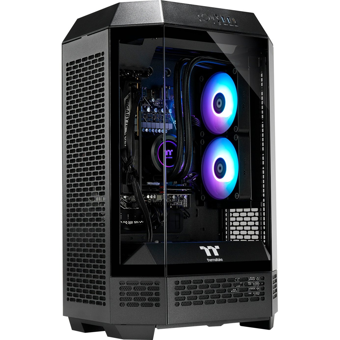 Gaming auf oberem Level mit dem FTW T300 5060 von Thermaltake! Dieser Gaming-PC wurde um einen mit Wasser gekühlten AMD Ryzen 7 8700F Prozessor herum aufgebaut, hinzu kommen 32 GB DDR5-Arbeitsspeicher und ein blitzschneller Massenspeicher in Form einer 1 TB großen M.2-PCIe-SSD. Dank der NVIDIA GeForce RTX 5060 Grafikkarte mit 8 GB GDDR7-Videospeicher wird dieses starke Gaming-Paket komplettiert. Das Thermaltake The Tower 300 Gehäuse stellt die Komponenten effektvoll zur Schau – in der Form eines achteckigen Prismas und mit stylischer Glasverkleidung an der Front, die Gamer-Herzen höher schlagen lässt. Dieser PC lässt sich per Gigabit-LAN vernetzen und verfügt außerdem über verschiedenste Anschlussmöglichkeiten zum Verbinden von Peripheriegeräten und Monitoren.