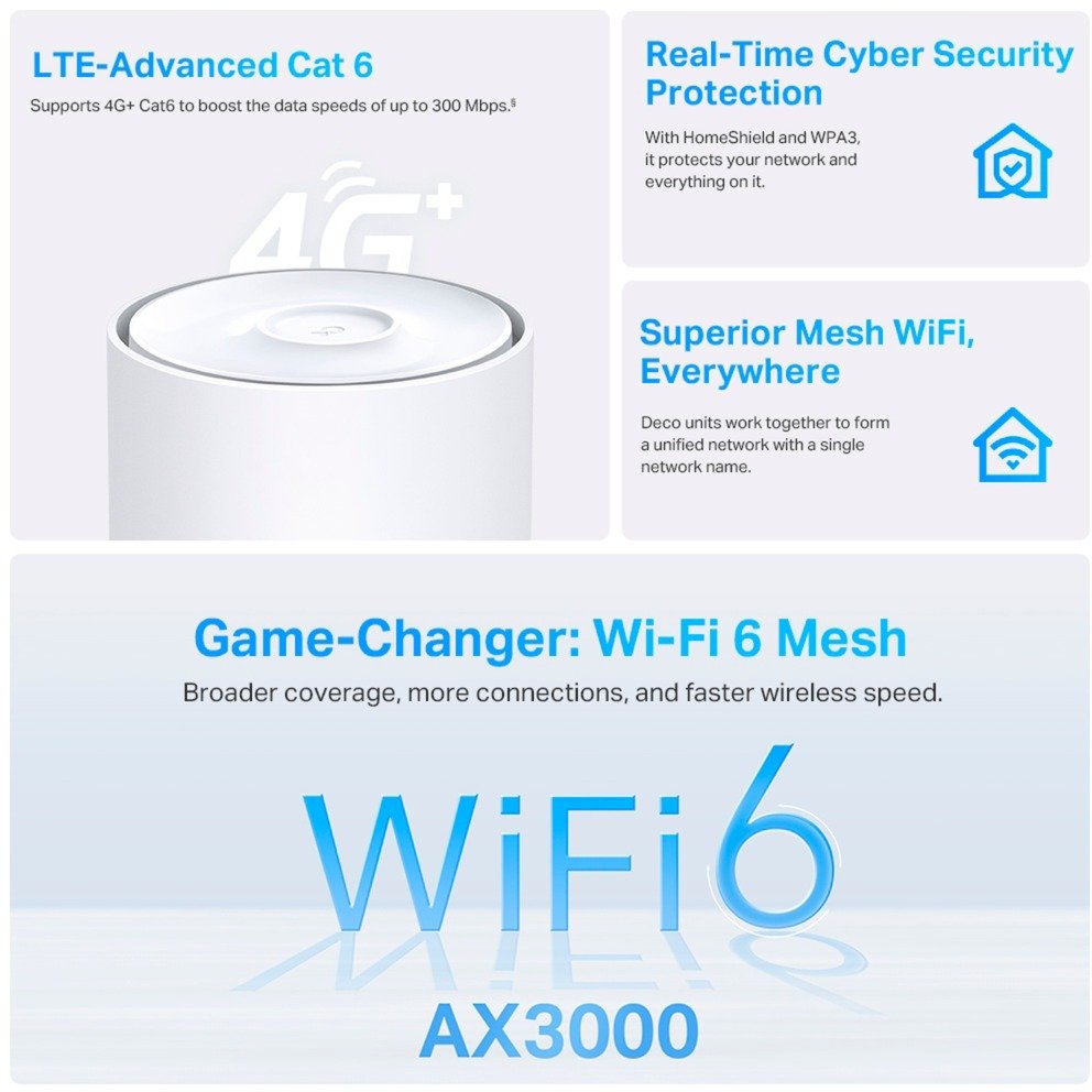 El TP-Link Deco X50-4G garantiza un acceso flexible a Internet y WiFi sin interrupciones en cualquier lugar de la casa. El Deco X50-4G. Experimente Internet rápido, alta seguridad y cobertura WiFi sin interrupciones con el sistema WiFi de malla LTE-Advanced Cat 6. Compatible con 4G+ Cat 6 para velocidades de descarga de hasta 300 Mbps, ideal para streaming, juegos y trabajo desde casa. La avanzada tecnología de malla WiFi 6 proporciona un mayor alcance, más conexiones simultáneas y un rendimiento estable. Múltiples dispositivos Deco forman una red unificada con un solo nombre, en todas partes de la casa. Con HomeShield y WPA3, el sistema protege de forma fiable su red y todos los dispositivos conectados de las amenazas cibernéticas. Una experiencia Wi-Fi sólida y segura para toda tu casa: simple, rápida y segura.
