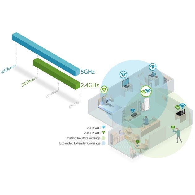 | Velocidad de transferencia | 300 Mbps (WLAN de 2,4 GHz), 433 Mbps (Wi-Fi 5 GHz) | ||