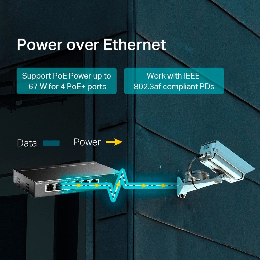 El switch TL-SF1006P admite el suministro PoE de acuerdo con los estándares PoE IEEE802.3af y at. El consumo máximo de PoE de 67 vatios de los dispositivos PoE es óptimo para oficinas, dormitorios y oficinas de pequeñas empresas. El conmutador es totalmente compatible con cámaras IP, puntos de acceso, teléfonos IP, ordenadores, impresoras y muchos otros dispositivos de red.