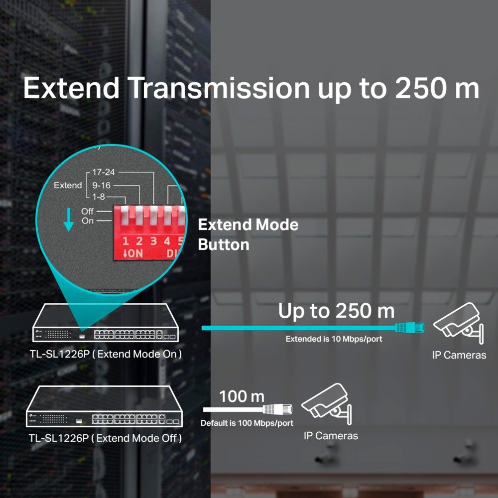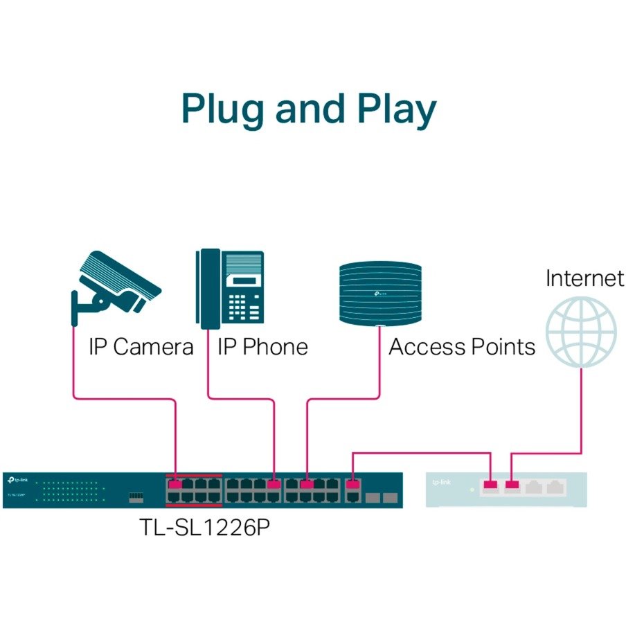 El TL-SL1226P es un conmutador PoE+ de 24 puertos dedicado para una amplia gama de aplicaciones con un presupuesto PoE de 250W. El cumplimiento del estándar 802.3af/at PoE+ admite hasta 30 W en cada puerto PoE. El presupuesto total de energía PoE de 250 W* para los puertos PoE de 24 × ofrece una amplia gama de aplicaciones, como vigilancia, oficinas, dormitorios y pequeñas empresas. Es totalmente compatible con cámaras IP, puntos de acceso, teléfonos IP, ordenadores, impresoras, etc.