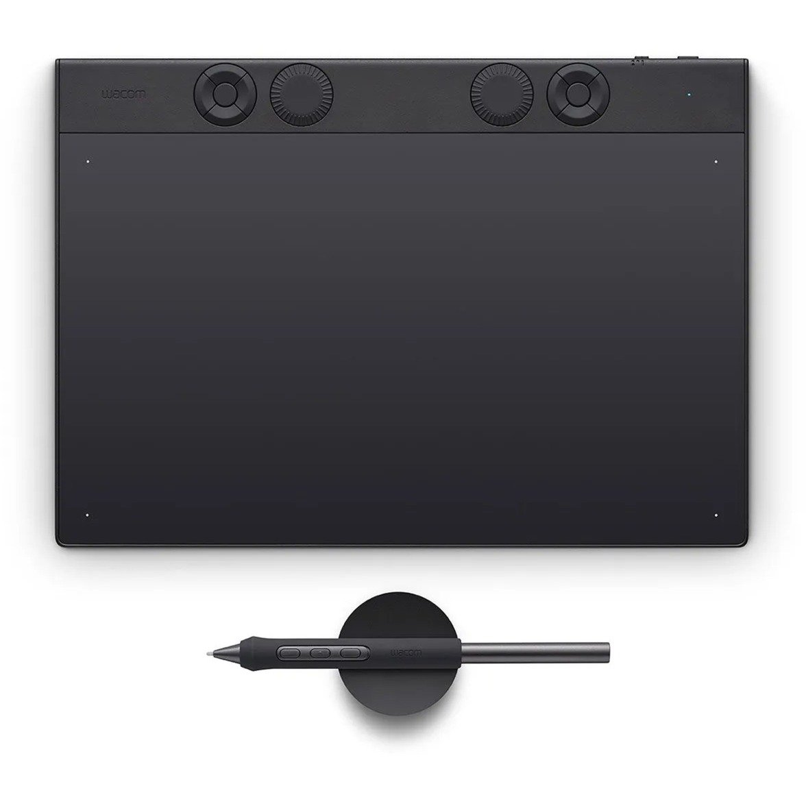 Diseñada para artistas que necesitan una herramienta versátil, la Wacom Intuos Pro Medium permite un flujo creativo sin interrupciones. Con un cuerpo de 291 x 206 mm y una generosa área activa de 263 x 148 mm, ofrece una precisión que no va en detrimento de la portabilidad. La Wacom Intuos Pro Medium está equipada con dos nuevos diales diseñados con precisión para mejorar el funcionamiento de herramientas creativas como líneas de tiempo, zoom y niveles de color. Se pueden controlar con un dedo mientras se sostiene un lápiz en el otro, y permiten que los ajustes precisos y calibrados con un clic se integren sin problemas en el flujo de trabajo. Las ExpressKeys circulares de diseño ergonómico proporcionan un acceso rápido y sin esfuerzo a los accesos directos más importantes. La posición en ambos lados de la unidad proporciona el más alto nivel de comodidad a través del uso mínimo de movimiento mientras se mantiene la eficiencia. La Wacom Intuos Pro Medium incluye una superposición de textura mejorada con textura estándar y tres tipos de puntas duraderas: punta estándar (POM), de fieltro y de goma, cada una para adaptarse a diferentes preferencias artísticas. El interruptor selector USB/Bluetooth permite cambiar sin problemas entre varios dispositivos conectados. Con 8.192 niveles de sensibilidad a la presión, tres interruptores laterales y detección de inclinación de 60°, el nuevo Wacom Pro Pen 3 es totalmente versátil: el peso, el grosor de la empuñadura, los botones del lápiz y la distribución del peso se pueden configurar para adaptarse a tu estilo de trabajo personal para experiencias creativas inolvidables.