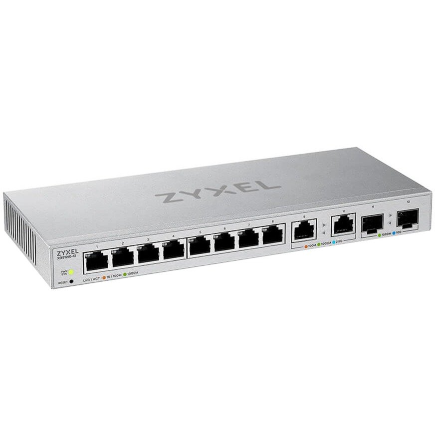 El Zyxel XGS1210-12 tiene ocho puertos Gigabit Ethernet, dos puertos de 2,5 Gigabit y dos puertos de enlace ascendente SFP+ de 10 Gigabit. Las interfaces SFP+ de 10 Gigabit transfieren rápidamente los datos desde el NAS u otro dispositivo de red importante a los dispositivos cliente. El Zyxel XGS1210-12 es compatible con los puntos de acceso WiFi 6 (802.11ax) y WiFi 5 (802.11ac), que se pueden conectar al XGS1210-12 a través de los puertos de 2,5 Gigabit para obtener la máxima velocidad inalámbrica. El XGS1010-12 está diseñado específicamente para usuarios que necesitan una conectividad de red de 10 GbE rentable en una variedad de entornos mixtos, desde el hogar hasta la oficina.
